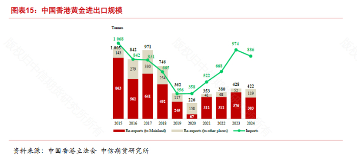 与此并行,中国香港实物流通端显著扩容:2024 年黄金进口量升至约886 吨,较 2019 年大幅增长;而对中国内地的再 出口在十年内下降至约303吨,显示更多黄金在本地沉淀用于仓储、加工与交易活动。结构性变化意味着 中国香港正从传统的贸易中转端转型为区域黄金储备与清算中心。