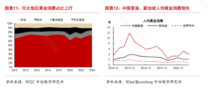 终端需求与离岸需求双线强化,中国香港与新加坡正从区域市场走向全球黄金体系的关键枢纽。印太地区长期超过2000吨的黄金消费量提供了全球需求的底盘,而中国香港与新加坡的财富管理规模、人均消费强度与金库承载能力进一步把区域需求转化为可见的离岸储备与交易需求。