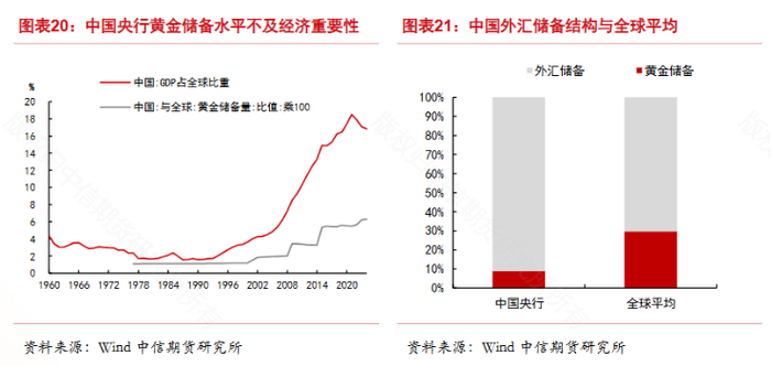 从结构视角看,经济规模与黄金储备之间的长期错配正在成为推动官方部门持续增持的核心因素。过去四十年,中国在全球 GDP中的占比由不足 2%升至 2024 年的约17%,但同期官方黄金储备占全球比重仅由约1.1%抬升至6.3%,两者之间的结构性缺口持续扩大,反映当前黄金储备水平与经济体量及外部风险暴露程度并不匹配。