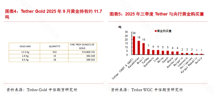 稳定币发行公司成为购金“新势力”,需求比肩央行。Tether在最新的2025年9月储备披露中继续提高黄金配置,其资产负债表中约有7%-8%配置于实物贵金属资产,其中用于USDT储备的黄金折算约 104吨,XAU产品对应的托管黄金约11.7吨,整体黄金持有规模接近116吨,已达到中小经济体央行的年度购金量水平。