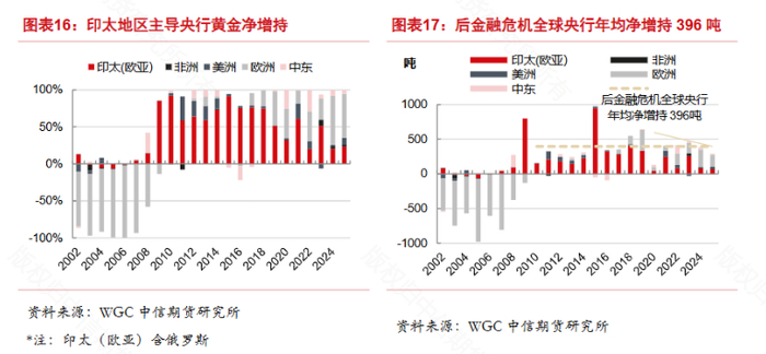 需求重心东移与财富外溢同步强化,印太黄金需求体系形成主导力量。印太地区过去十余年始终贡献全球最大规模的实物黄金需求,且在 2021- 2024 年重新回升至约 2000 吨的高位,消费需求占比由 65%升 至 74%,显著高于美洲和欧洲消费量。
