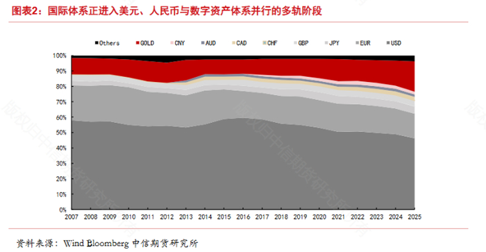 在全球制度体系分裂与安全边界下移的背景下,外汇储备向多元化转型加速,黄金因不受清算体系约束、可跨境自由流通而重新获得战略意义。同时,国际体系正进入美元、人民币与数字资产体系并行的多轨阶段,跨体系可用性成为储备资产的重要衡量指标。