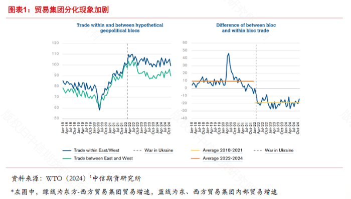 WTO最新监测显示,全球贸易流在疫情冲击、俄乌战争以及政策不确定性上行的共同作用下,已出现沿地缘政治线加速重组的迹象:以联合国大会投票偏好构建的假想贸易集团为例,自俄乌冲突爆发以来,跨贸易集团贸易增速较贸易集团内部慢约4%,表明贸易方向正在被政治关系重新塑形。