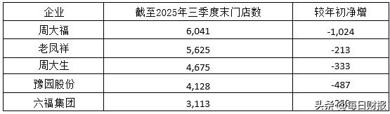 黄金价格持续攀升抑制终端消费性需求,处于产业链中下游的“珠宝首饰加工及销售”行业,陷入了“价格高企→需求萎缩→销量下滑→业绩承压”的恶性循环中,传统的“跑马圈地”式的经营模式宣告失效,头部品牌普遍选择战略性收缩。截至2025年三季度末,周大福、老凤祥、周大生等头部企业的门店数量均大幅缩减,闭店数量超2000多家。