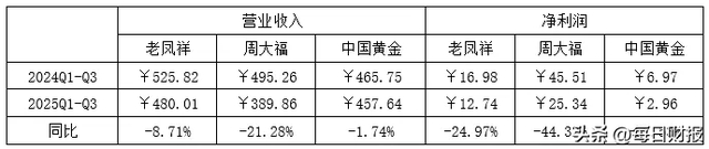 中国黄金作为头部品牌,加盟渠道同样面临规模收缩和效率下滑的双重压力。背后的逻辑也很简单,对于头部品牌来说,传统的加盟模式下利润最高的无非是“品牌使用费”、“管理服务费”等这类加盟“衍生品”,但是在消费性需求萎缩下加盟商的销量上不去,叠加“水贝模式”对行业利润空间的挤压,导致部分加盟商失去销量的同时也无法从利润率中得到补偿,只能接受“优胜劣汰”的自然法则。加盟商的缩减也直接影响品牌商的业绩,同样陷入销量、利润率双降的被动局面。2025年前三季度,老凤祥、周大福、中国黄金三家的净利润分别同比下滑24.97%、44.32%和57.53%。
